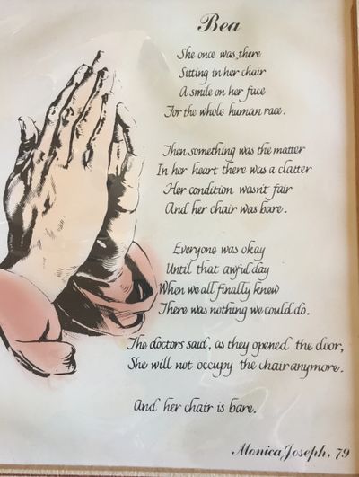 An elegiac poem written by Bea's then 13 year old granddaughter Monica Joseph in 1979